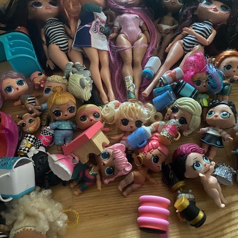 L.O.L. Surprise dukker med diverse tilbehør inkludert kuler, sko, klær, vesker og små gjenstander.