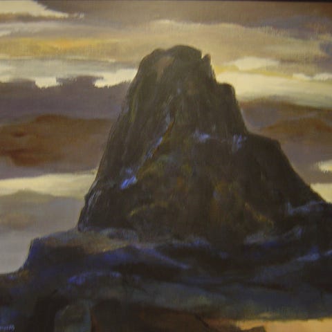 Fotografi som viser steiner i vann ved kysten. Bildet har en rolig og dempet fargetone med grå og blå og grå fargetone.
