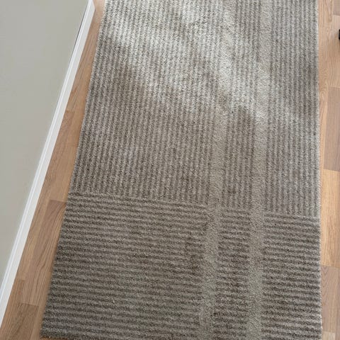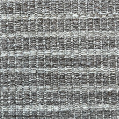 Skeidar ull teppe i størrelse 200x290 cm med lysgrå farge. Teppe har et strukturert mønster,håndhevet.
