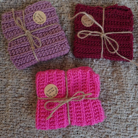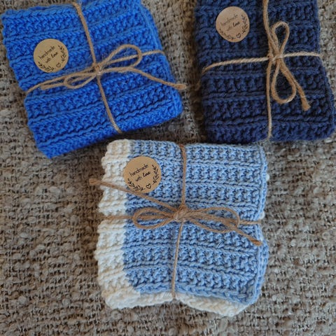 Håndlagde strikkede vaskekluter i blågrønne toner