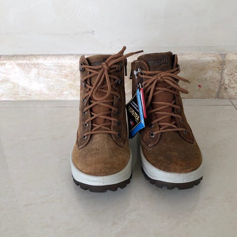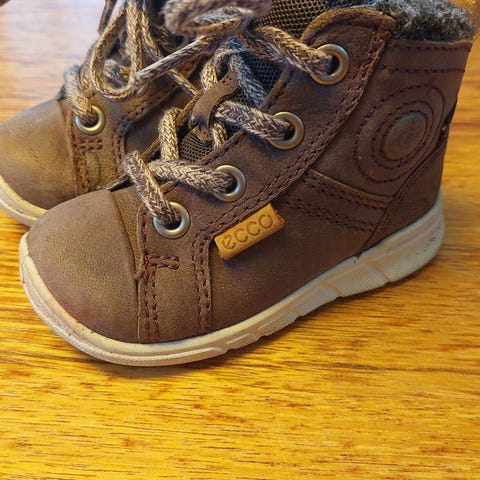 Vintersko i skinn fra Ecco i str. 19 selges. Lette og med godt feste, med borrelås. Behagelige å ta av og på. God støtte for ankel. Mye bruk igjen! Skoene er vanntette med goretex.