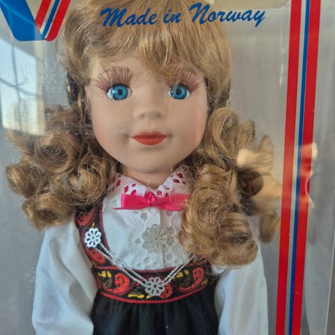 To dukker kledd i tradisjonelle bunadsklær med broderte broderier, hvit skjorte en i Telemarks bunad helt fin dukke med klare fine øyne og fint hår. Ene hekte er ødelagt. Dukke med Valdresbunad den eldste Annelise med sidevinder. Tynn i håret foran. Sølvlås fra Hovda Sylvi og tre på veska1700 for Telemark og 1900 for Valdres. Se også mine andre annonser .