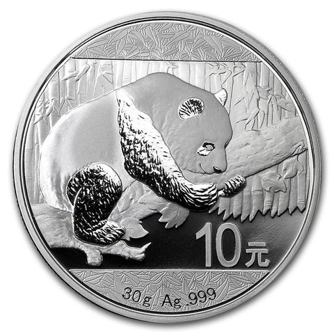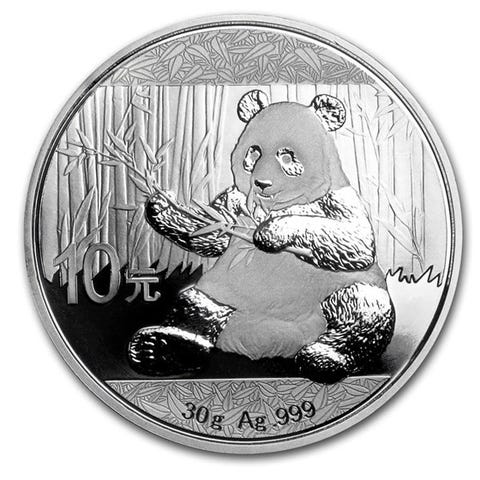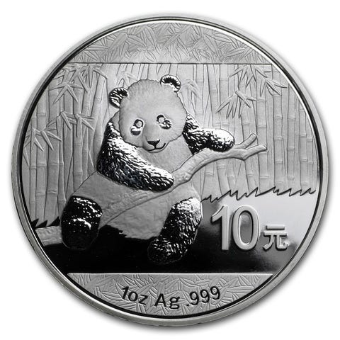 Blanding av bullion og samlermynter, inkludert Silver Panda med premie.