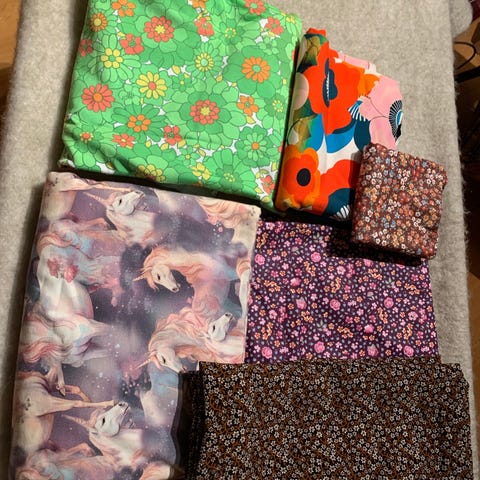 Stoff med blomstermønster i fargene grønn, rosa, blå og gul. Antagelig bomulls og syntetisk blanding. 60-70-tallet? Bredde 112 cm, lengde 480 cm.