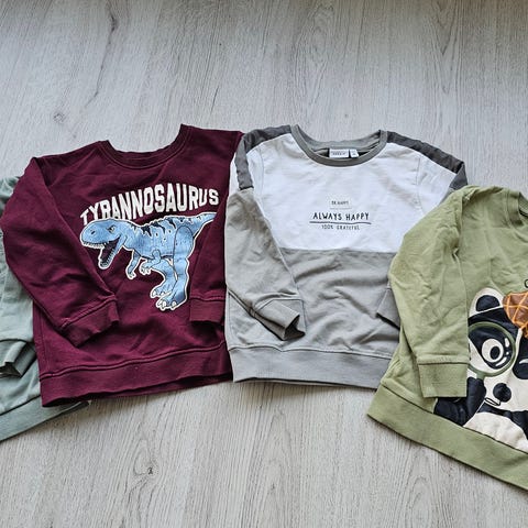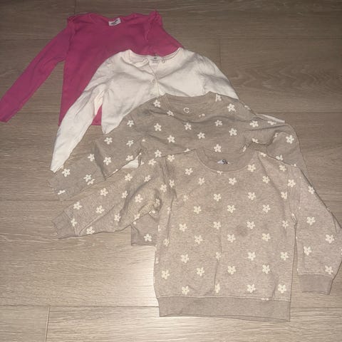 Genserpakke med 7 tynne gensere, den ene er 110 men brukt med 104. 2 colleggensere der den grønne er noe maling på som ikkje er forsøkt fjernet og en brun «strikker» genser fra Zara i 98 men brukt med 104