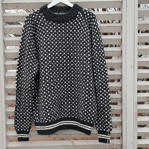 Ferdig montert hjemmestrikket ullgenser type islender. Farge hvit og oliven grønn.