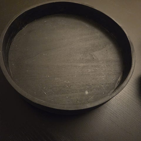 Det ene fatet er ikke helt perfekt sirkel, men det er laget sånn. Noen små bruksriper og en liten skade på det ene fatet, se bilde. Det svarte som vises litt på bildene er telefonen min som vises i speilet.