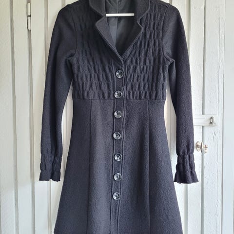 Jakkene er i str.S. syntes de er mer str.xs. Jakkene pent brukt få ganger. Kåpe er med ull fra Vila. Blomstrete kjole. Blå kjole er silke. Kjolene er Str.S.