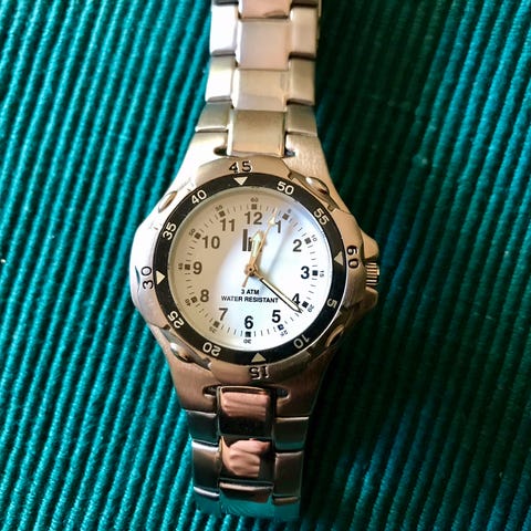 Dameklokke med beige rem og rund urskive. Klokken har en enkel og stilren design med markører for timer og minutter. Egnet for daglig bruk og formelle anledninger.