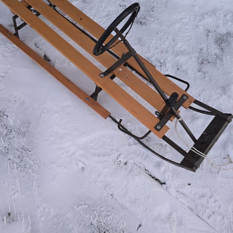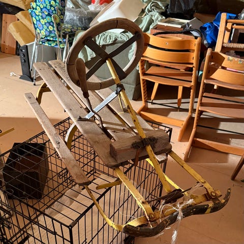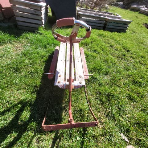 Godt brukt/slitt - trenger lakkering og rustfjerning. 1 av ratt-kjelkene har problemer med sving.