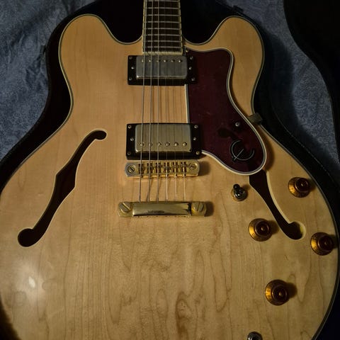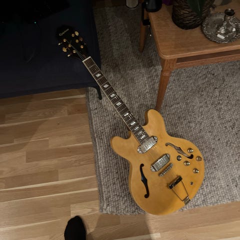 Epiphone Casino Natural halvakustisk gitar med naturlig finish. Modellen har to P90 pickup, en klassisk design med dobbel cutaway og f-hull. Gitaren er egnet for ulike musikkstiler og har en kropp som gir akustisk resonans kombinert med elektrisk forsterkning.