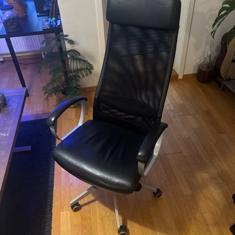 IKEA Markus kontorstol med armer. Godt brukt men fortsatt veldig behagelig og i god stand. Hev senk fungerer som den skal og ryggen kan låses/åpnes. Bra stol, men selger da vi flytter ut av kontoret.