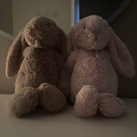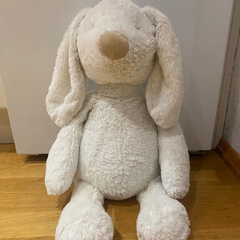 En blå kaninkosebamse selges. Stått som pynt på barnerommet.