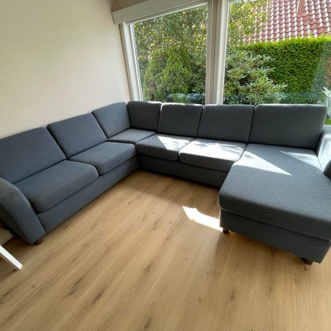 Hjørnesofa selges, må hentes. Sofa trekk kan vaskes. Kan tas fra hverandre i 3 deler.