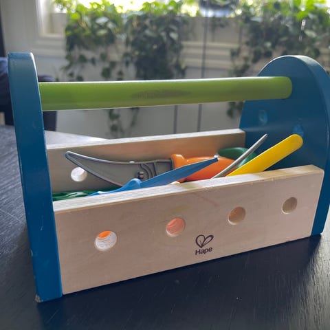 Verktøykoffert leketøyssett med verktøy og arbeidsbenk