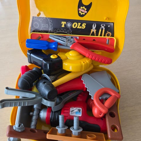 Leketøyssett i form av en verktøykoffert med flere plastverktøy som hammer, skrutrekker, skiftenøkkel og muttere. Settet inkluderer en arbeidsbenk med tannhjul og knapper. Kofferten er gul med svart håndtak og kan lukkes for enkel oppbevaring og transport. Passer for barn som ønsker å leke med verktøy og utvikle motoriske ferdigheter.