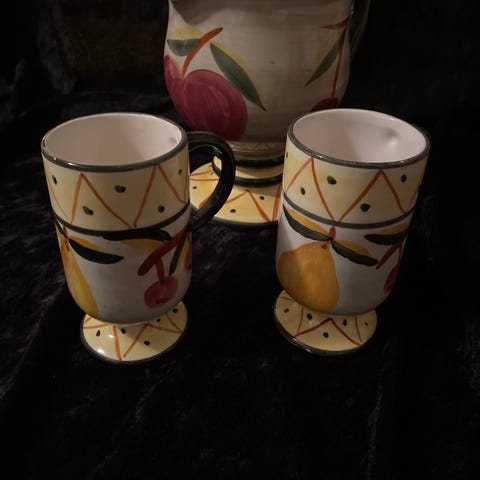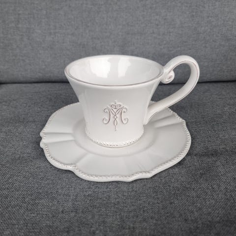 krus med ulike motiver: hjerte, stjerner og tekst "KEEP CALM & CARRY ON". Krusene er laget i keramikk og har en hvit basefarge med svarte og grå detaljer.