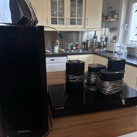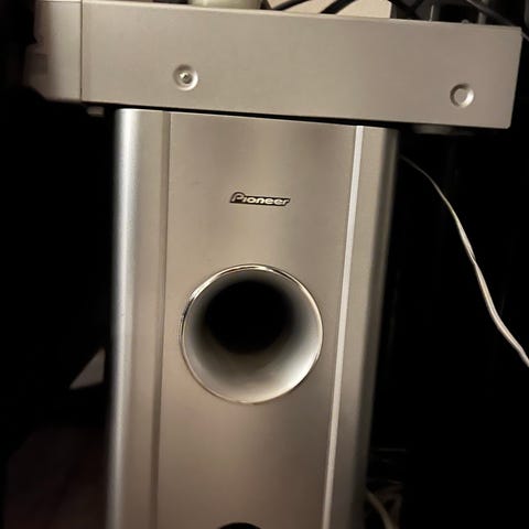 Pioneer hjemmekinosystem med flere høyttalere og subwoofer i svart og sølvfarget design. Systemet inkluderer en hovedenhet med tilkoblingsmuligheter for lyd og video, samt fjernkontroll. Passer for bruk i hjemmekinooppsett.