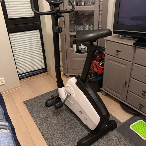 Høykvalitets spinningsykkel med nytt sete og nye klikkpedaler selges til hbo 500kr. Feilfri og solid. Trinnløs, manuell justering av motstand. Justerbart sete og styre