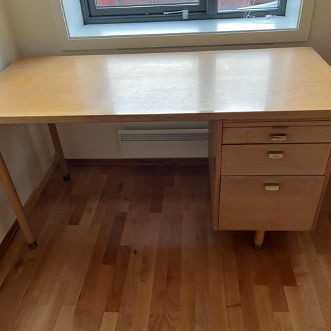 Brukt skrivebord i eikefiner til salgs. Ukjent alder, ukjent fabrikant. Kjøpt brukt og siden tilpasset. Plata kan snus slik at skuffene kommer på den andre siden, eller man kan bytte ut plata.