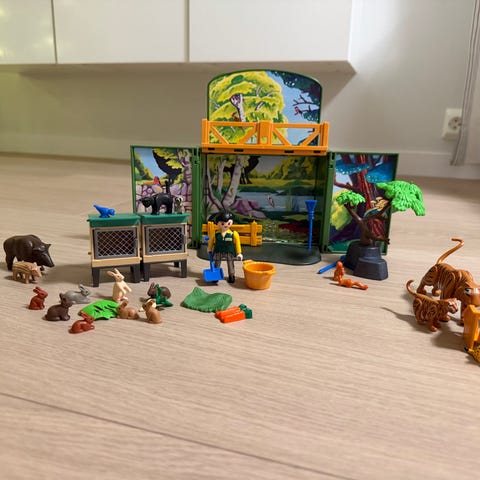 Fin zoologisk hage med kaniner, ekorn , hunder, to hundehuset, sauer, og zoo-arbeider selges. En samling av diverse playmo dyrepakker