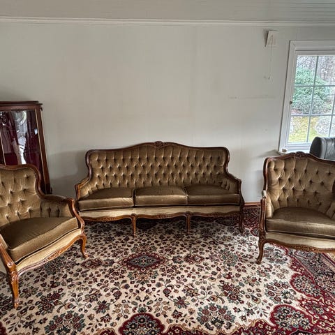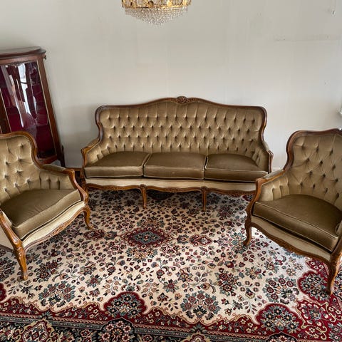Sofa- og stolsett med grønn polstring og mønstret stoff. Settet inkluderer en tre-seters sofa, to lenestoler og et trebord med dekorative utskjæringer. Møblene har treverkdetaljer og er designet for stuebruk. Meget behagelig sittekomfort.
