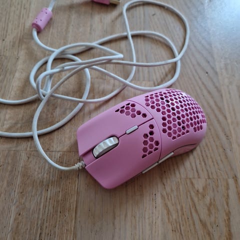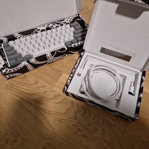 Glorious Model O mus og tastatur sett i hvit farge. Musen har et perforert design for redusert vekt og bedre ventilasjon. Tastaturet er kompakt med kablet tilkobling og hvite taster med en gul enter-tast.