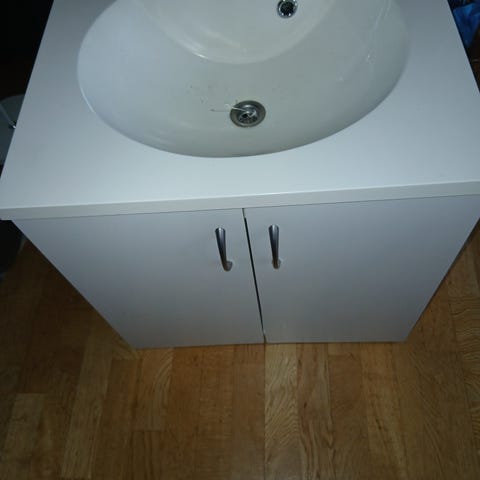 Eldre dobbeltservant bredde 150 cm og dybde 47 cm med 2 nye blandebatteri selges. Liten sprekkdannelse i overflaten på den ene servanten (ikke sprekk helt gjennom hele servanten).