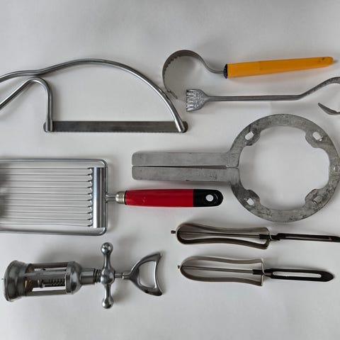 kjøkkenredskap, vintage, retro, 1950, 1960, 50-tall, 60-tall, 30-tall, boksåpner, ostehøvel, osteskjærer, turbestikk, speiderbestikk, spiralkutter, agurk, gulrot, Westmark, Kernex, cherry pitter, kjernefjerner, kirsebær, olive pitter, knivsliper, A&J, knife sharpener, korketrekker, flaskeåpner, Mikkel, Mikel, flaskelukker, opptrekker, gul, grønn, samling, samleobjekt, collectible, nostalgisk, kjøkken, patina, skandinavisk, nordisk, antikk, dekor, kjøkkendekor, håndverk, klassisk, tradisjonell, Tyskland, German, Westmark Kernex ? vintage cherry olive pit remover in metal, knivsliper med grønt håndtak Vintage A&J Green Handle Knife Sharpener 1930s ?, korketrekker med trehåndtak, flaskeåpner lukker til flasker, bokseåpner, norsk vintage samleobjekter, Mikkel mikel kombinert åpner og lukker flaskeåpner opptrekker, pitter, knivsliper fra 1930-tallet, gul grønn, metall