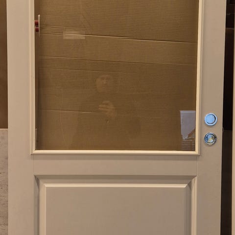 Innerdør i hvit farge med tilhørende metallhåndtak og nøkkellås. Døren er laget for innendørs bruk og har standard mål tilpasset vanlige døråpninger. Egnet for bolig eller kontor.