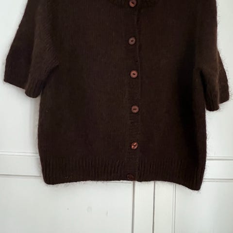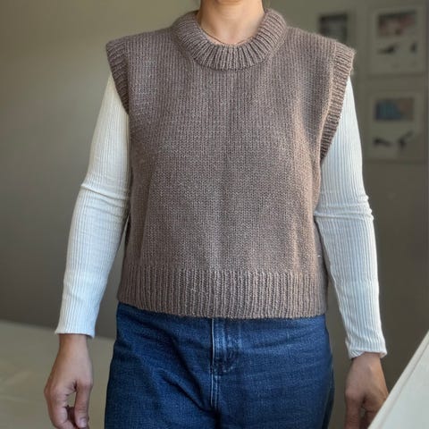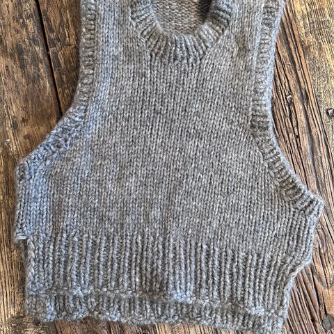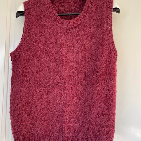 Pent strikket Sille Slipover fra PetiteKnit i størrelse S. Ny og ubrukt - den ble litt for stor for min smak, dessverre. Strikket i én tråd Sandnes garn Double Sunday (farge: Monk’s Robe). Vanskelig å gå korrekt farge på bildene, men veldig kledelig brunfarge. Garnpris: 480kr.