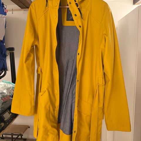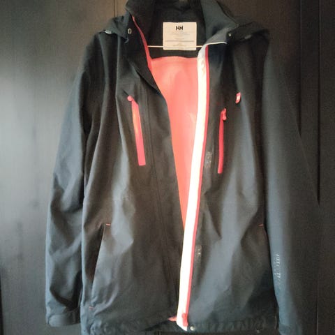 Helly Hansen regntøy for dame i størrelse L. Jakken er hvit og designet for utendørs bruk i våte forhold.
