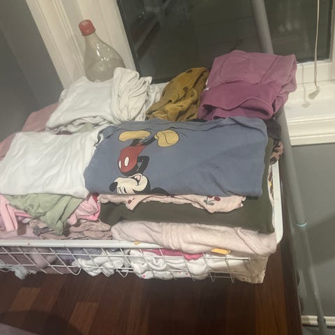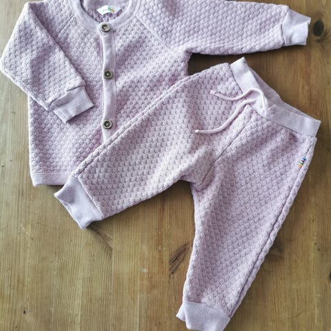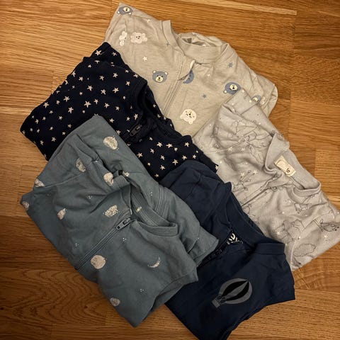 14 pyjamaser, ingen skade eller flekker som jeg har sett. Her har vi likt å bruke pysj inne da det er mykt og lett å bytte bleie.
