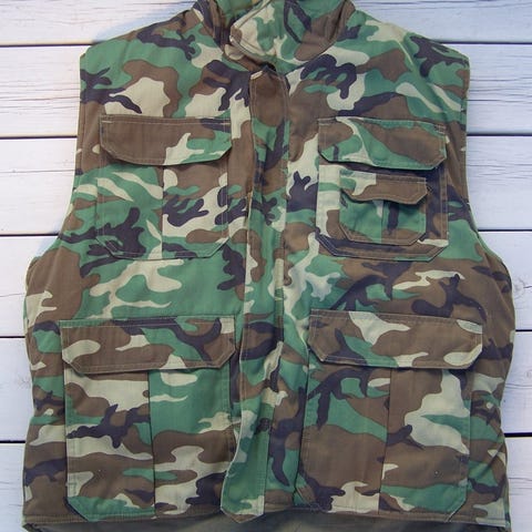 Forsvarets feltutstyr ammunisjonsveske i camouflage mønster. Vesken har klaff med knappelukking, innvendig rom for oppbevaring, og metallfeste for montering på belte eller annet utstyr. Egnet til oppbevaring av ammunisjon eller annet feltutstyr.