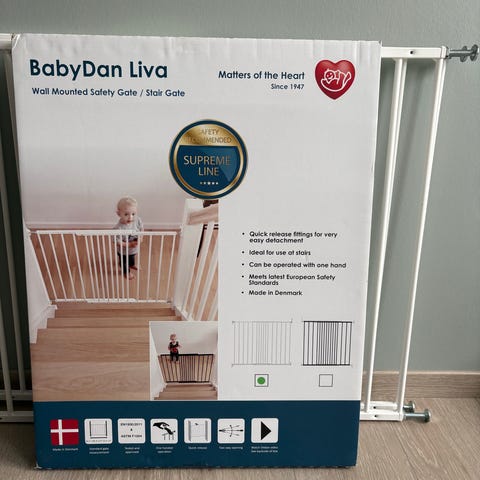 BabyDan Barnesikring i hvitt metall, designet for å sikre åpninger og forhindre at barn får tilgang til visse områder. Passer for bruk i hjemmet for økt sikkerhet.