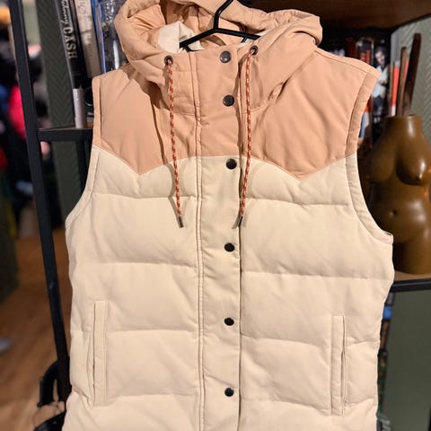 Patagonia W Hooded Down Vesten har en hette og knappeåpning foran.