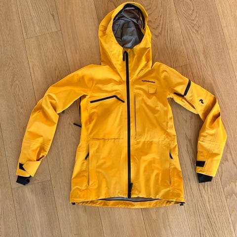 Veldig fin Peak Performance Gore Tex, str XS’ for kvinner. Soft Shell jakke. Jakken er veldig mørk blå, fremstår sort, med hvite innslag. Den har mange fine detaljer og er merket med Recco, avalanche rescue system. Lommer både på utsiden og innsiden, hette med justering, mulighet for å åpne under armene, snøskjørt osv.