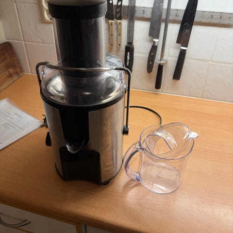 Holm slowjuicer med svart og stål farge. Leveres med flere deler for enkel montering og rengjøring. Egnet for å lage juice fra ulike frukter og grønnsaker.