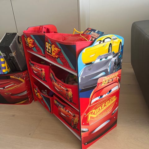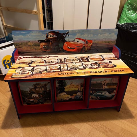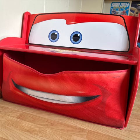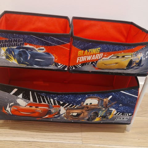 IKEA Cars barneskrin oppbevaringsboks med motiv fra filmen Cars. Laget i fargerik plast med røde kanter og blått lokk med biltrykk. Egnet for oppbevaring av leker og annet barnemateriell.