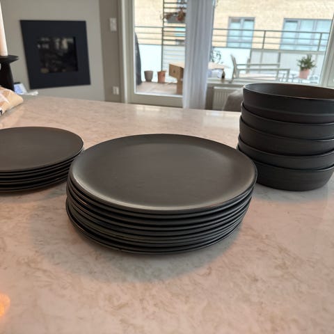 IKEA servise bestående av svarte tallerkener og boller.