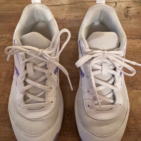 Puma håndballsko i størrelse 36 med hvit farge. Skoene har snøring og gummisåle med mønster for grep. Hentes i Kopervik, kan sende.