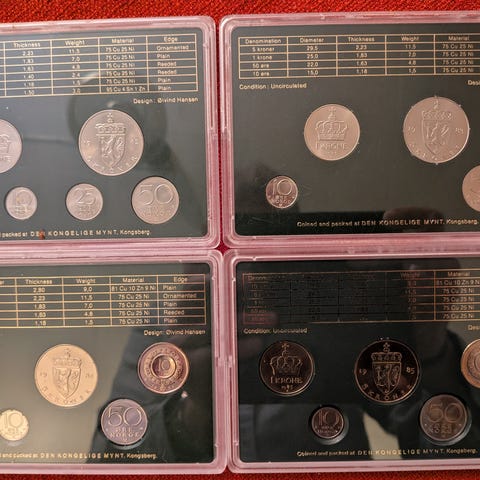 Norges myntsett fra årene 1983 1984 Hvert sett inneholder flere norske mynter i original emballasje.