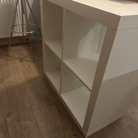 Kallax i hvit farge med 4 åpninger selges billig. Vanlig bruksslitasje, 4 filtføtter festet på undersiden.