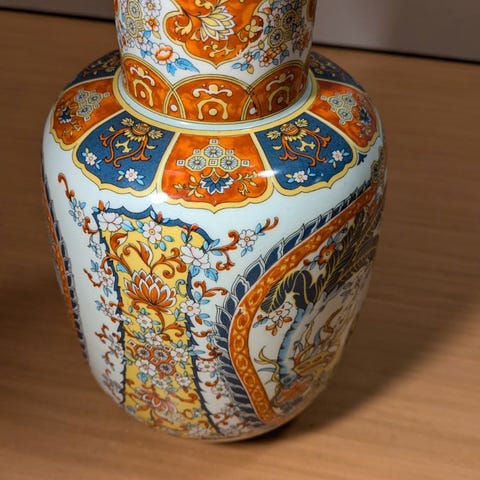 Håndmalt porselensvase med gullkant og blomstermotiv, ca 21 cm høy. Produsert i Japan på 1980-tallet med stempel under. Vasen er brukt og i god stand. Hel og intakt.