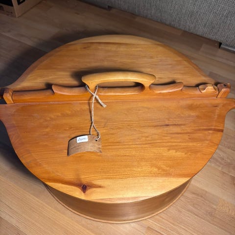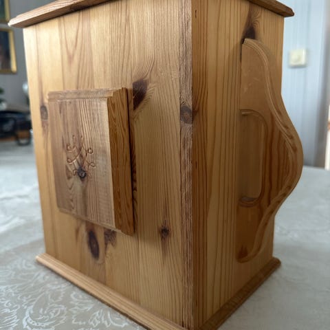 Hjemmelaget smørtine laget av en dyktig nabo som drev med treskjæring osv. Bare stått til pynt de 30 årene vi har hatt den. Hentes I Fredrikstad eller sendes for kr.135.