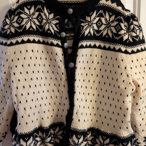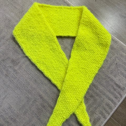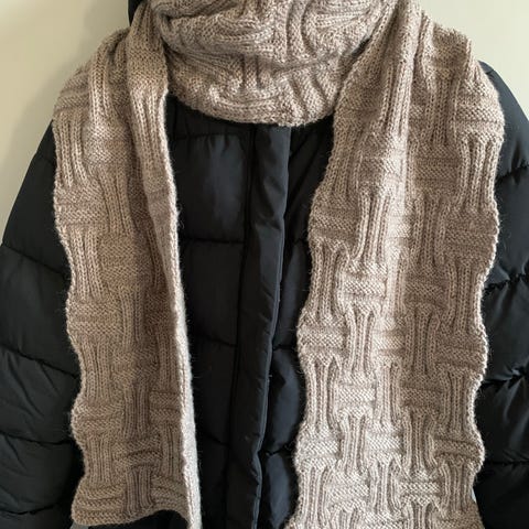 Hjemmestrikket skjerf i trekant form. Går to ganger rundt halsen.