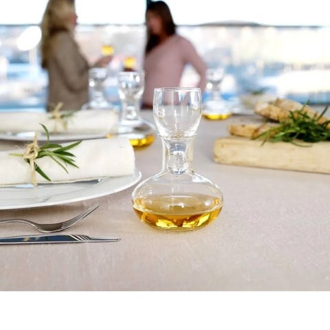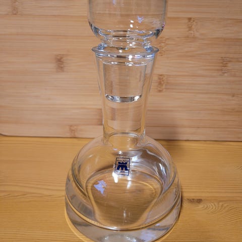 Randsfjord Glassverk kuver karaffel med tilhørende små glass. Materiale i klart glass. Rommer 1,5dl Har 4 stk.
