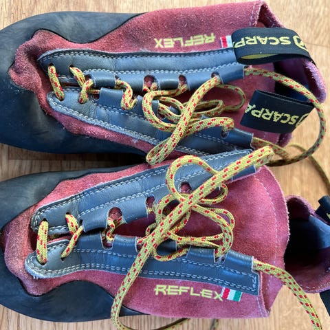 Scarpa klatresko i gul og svart farge, innvendig mål 19,5 cm, svarende til ca str 30 i vanlig skostr, sikkert litt mer i klatresko. Det står 37,5 F inni, men de er MYE mindre enn str 37 . Gummisåle for godt grep.