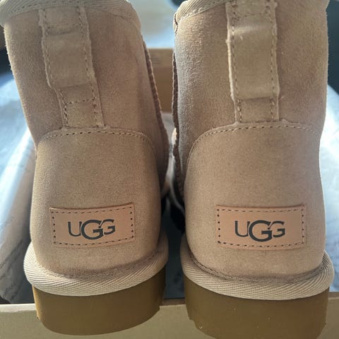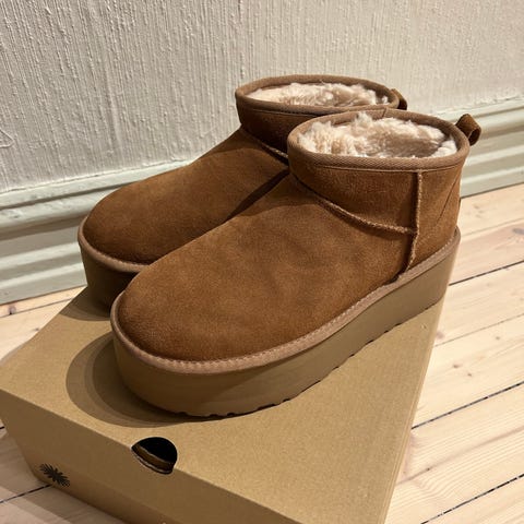 UGG Classic Mini i størrelse 40 med beige/sandfarget. Laget av semsket materiale med fôret innside for varme og komfort. Sålene har mønster for bedre grep. Egnet for kaldt vær. Splitter nye helt ubrukt
