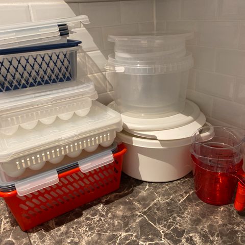 Bakeboller, såpedispenser, plastbeholdere, glassbeholdere, plastdessertskjeer, proteinshaker, brødform, mokkakanne, såpedispenser osv.